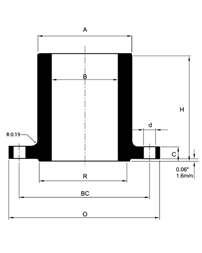 | الاسمي حجم الأنابيب (في) | الخارج قطر (مم) | سماكة من شفة دقيقة. (مم) | م ل نشأ وجه (مم) | مَركَز قطر في بطل (مم) | قطر من التجويف (مم) | طول خلال مَركَز (مم) | حفر | ||